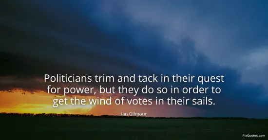 Gilmour, Ian. "Politicians trim and tack in their quest for power, but they do so in order to get the wind of votes in their sails." FixQuotes. January 16, 2026. https://fixquotes.com/quotes/politicians-trim-and-tack-in-their-quest-for-117637/.