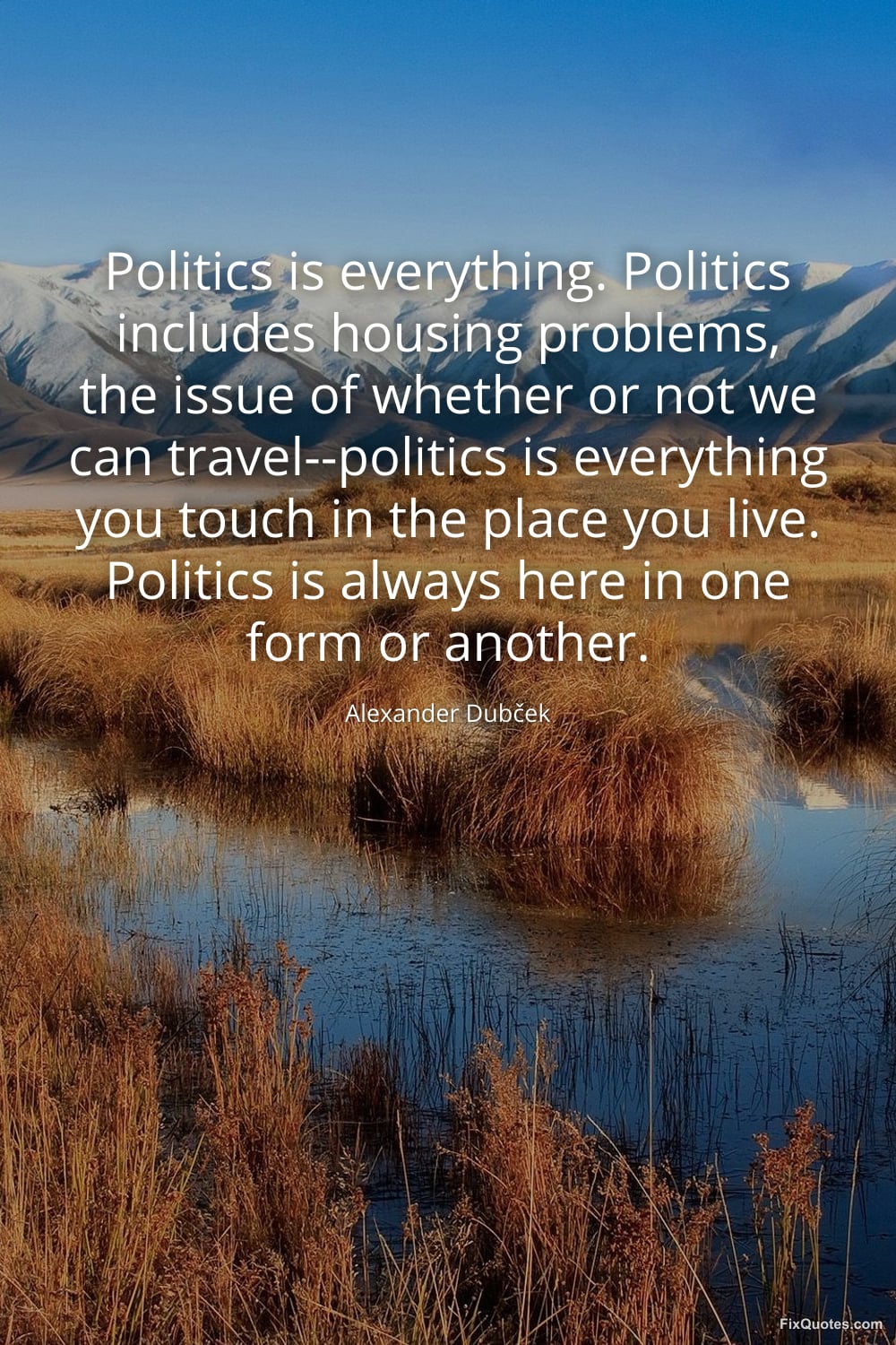 Dubček, Alexander. (2026, March 14). Politics is everything. Politics includes housing problems, the issue of whether or not we can travel--politics is everything you touch in the place you live. Politics is always here in one form or another. FixQuotes. https://fixquotes.com/quotes/politics-is-everything-politics-includes-housing-186086/