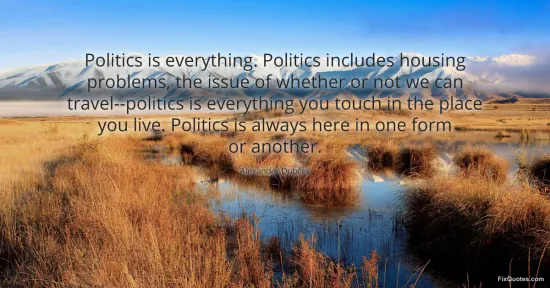 "Politics is everything. Politics includes housing problems, the issue of whether or not we can travel--politics is everything you touch in the place you live. Politics is always here in one form or another." FixQuotes, 14 Mar. 2026, https://fixquotes.com/quotes/politics-is-everything-politics-includes-housing-186086/. Accessed 14 Mar. 2026.
