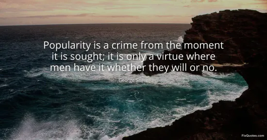 Savile, George. "Popularity is a crime from the moment it is sought; it is only a virtue where men have it whether they will or no." FixQuotes. January 18, 2026. https://fixquotes.com/quotes/popularity-is-a-crime-from-the-moment-it-is-17002/.
