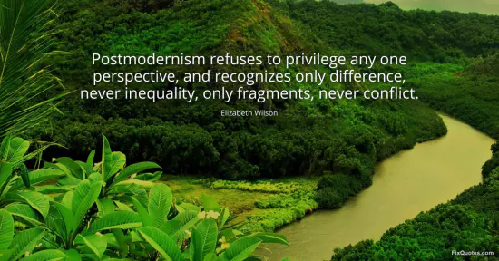 Wilson, Elizabeth. "Postmodernism refuses to privilege any one perspective, and recognizes only difference, never inequality, only fragments, never conflict." FixQuotes. January 15, 2026. https://fixquotes.com/quotes/postmodernism-refuses-to-privilege-any-one-119089/.