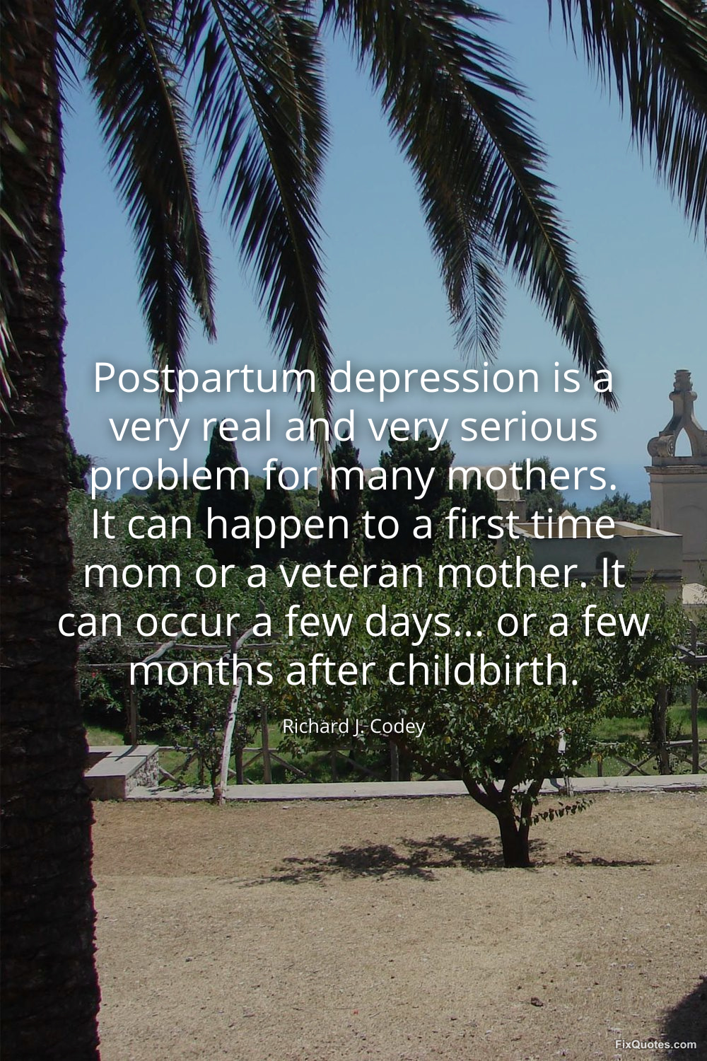 Codey, Richard J. "Postpartum depression is a very real and very serious problem for many mothers. It can happen to a first time mom or a veteran mother. It can occur a few days... or a few months after childbirth." FixQuotes. January 16, 2026. https://fixquotes.com/quotes/postpartum-depression-is-a-very-real-and-very-113351/.