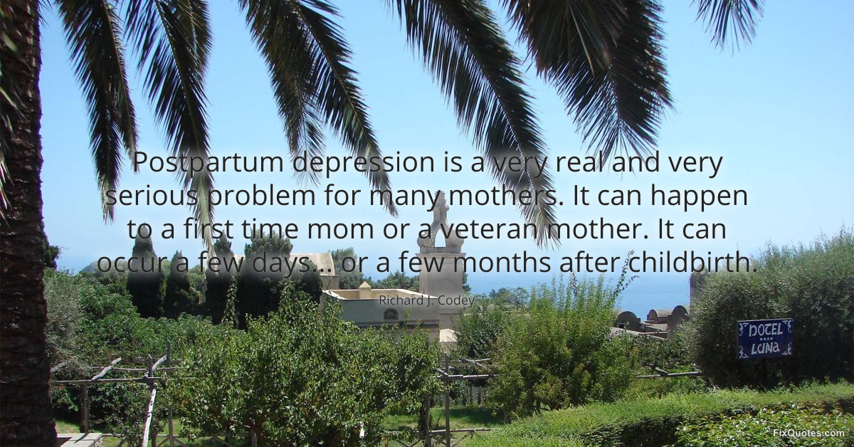 Codey, Richard J. (2026, January 16). Postpartum depression is a very real and very serious problem for many mothers. It can happen to a first time mom or a veteran mother. It can occur a few days... or a few months after childbirth. FixQuotes. https://fixquotes.com/quotes/postpartum-depression-is-a-very-real-and-very-113351/