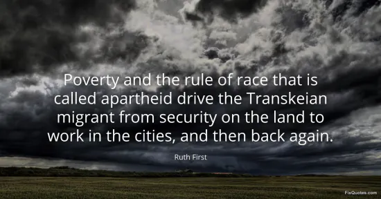 First, Ruth. (2026, January 15). Poverty and the rule of race that is called apartheid drive the Transkeian migrant from security on the land to work in the cities, and then back again. FixQuotes. https://fixquotes.com/quotes/poverty-and-the-rule-of-race-that-is-called-168448/