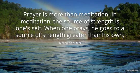 Stael, Madame de. "Prayer is more than meditation. In meditation, the source of strength is one's self. When one prays, he goes to a source of strength greater than his own." FixQuotes. January 18, 2026. https://fixquotes.com/quotes/prayer-is-more-than-meditation-in-meditation-the-21277/.