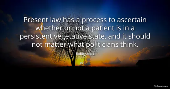 Scott, Bobby. "Present law has a process to ascertain whether or not a patient is in a persistent vegetative state, and it should not matter what politicians think." FixQuotes. January 17, 2026. https://fixquotes.com/quotes/present-law-has-a-process-to-ascertain-whether-or-61173/.