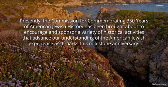 Porter, Jon. "Presently, the Commission for Commemorating 350 Years of American Jewish History has been brought about to encourage and sponsor a variety of historical activities that advance our understanding of the American Jewish experience as it marks this milestone anniversary." FixQuotes. January 17, 2026. https://fixquotes.com/quotes/presently-the-commission-for-commemorating-350-70037/.