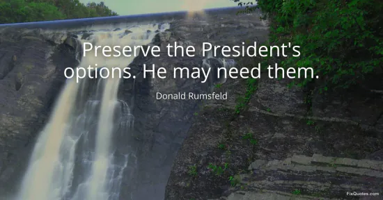Rumsfeld, Donald. (2026, January 17). Preserve the President's options. He may need them. FixQuotes. https://fixquotes.com/quotes/preserve-the-presidents-options-he-may-need-them-44715/