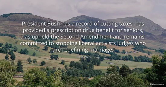 Shuster, Bill. "President Bush has a record of cutting taxes, has provided a prescription drug benefit for seniors, has upheld the Second Amendment and remains committed to stopping liberal activists judges who are redefining marriage." FixQuotes. January 17, 2026. https://fixquotes.com/quotes/president-bush-has-a-record-of-cutting-taxes-has-38447/.