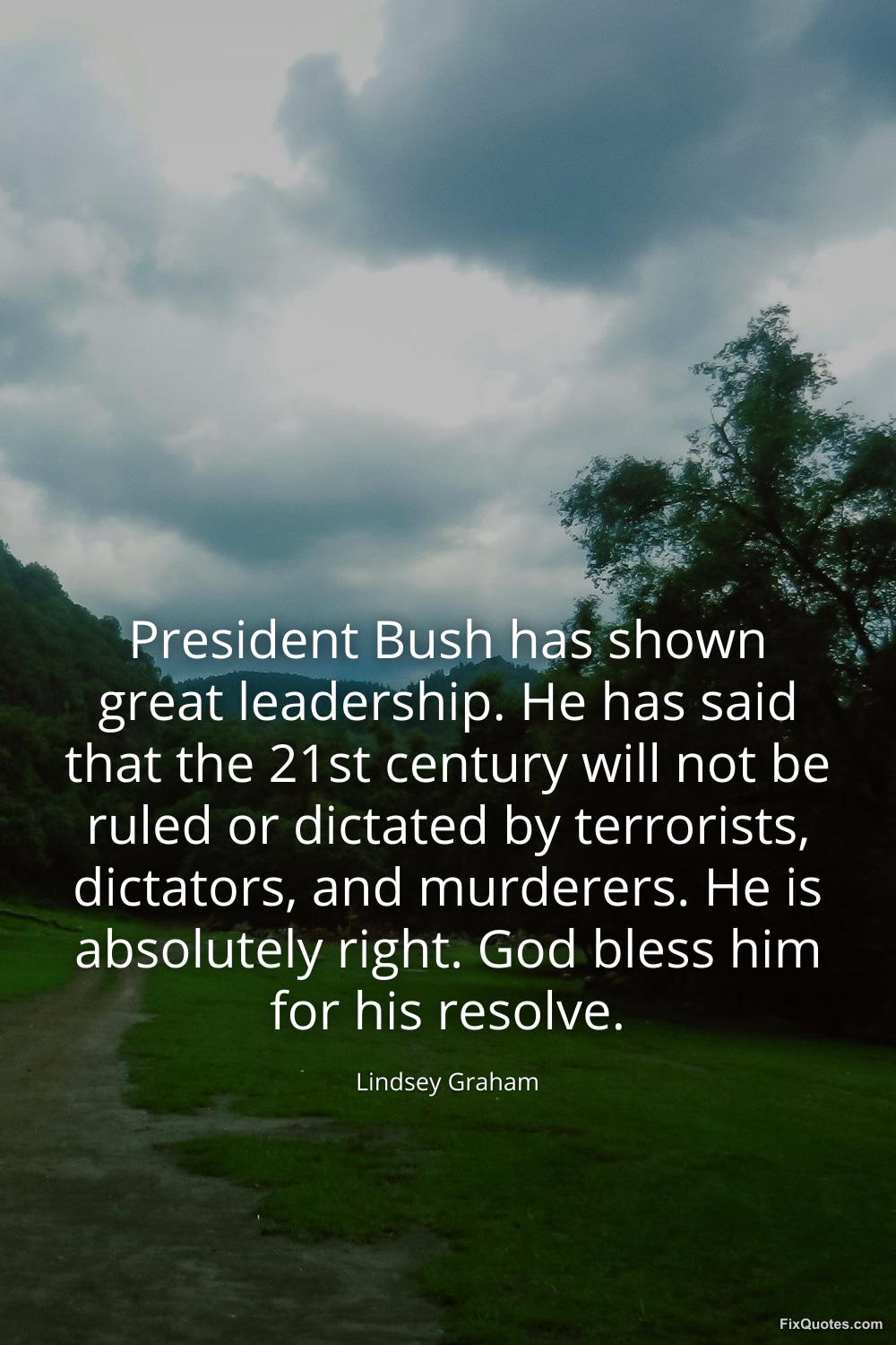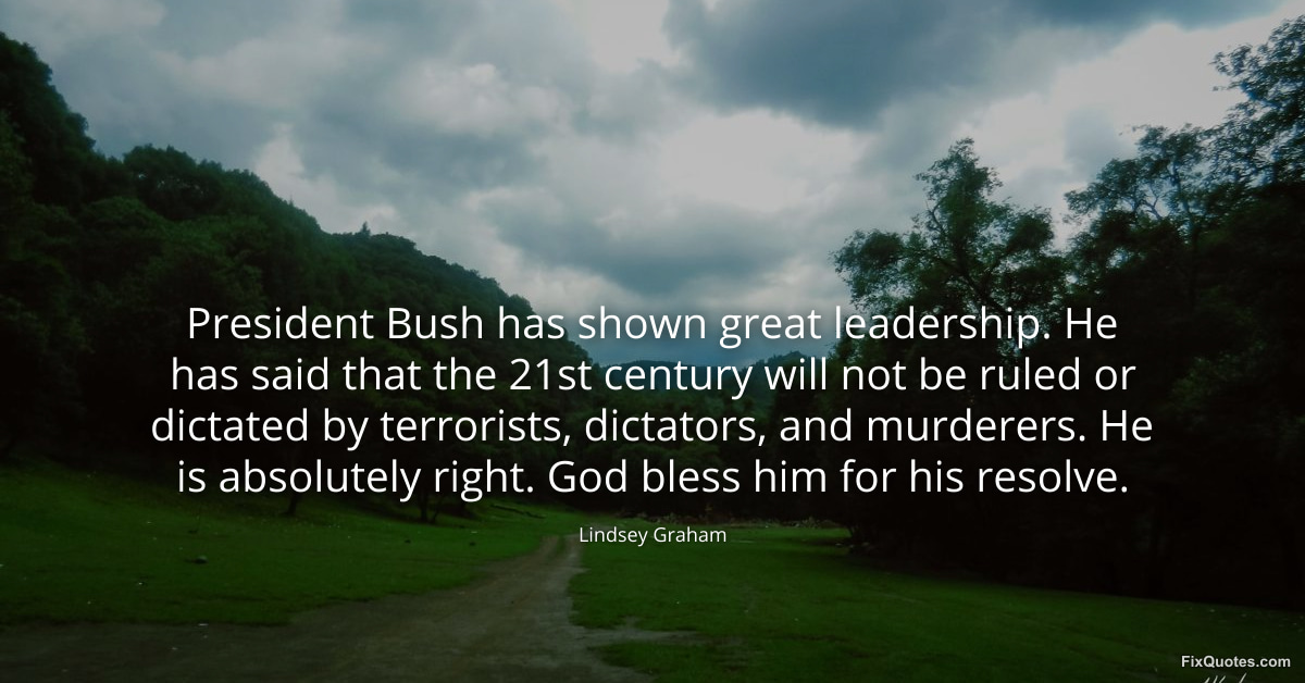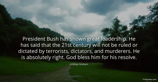 Graham, Lindsey. (2026, January 16). President Bush has shown great leadership. He has said that the 21st century will not be ruled or dictated by terrorists, dictators, and murderers. He is absolutely right. God bless him for his resolve. FixQuotes. https://fixquotes.com/quotes/president-bush-has-shown-great-leadership-he-has-88237/