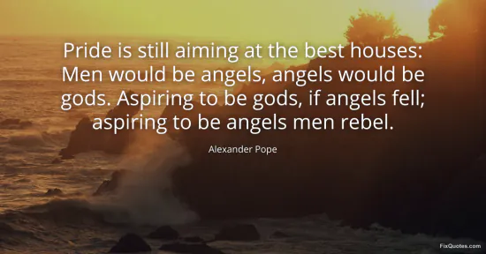 Pope, Alexander. "Pride is still aiming at the best houses: Men would be angels, angels would be gods. Aspiring to be gods, if angels fell; aspiring to be angels men rebel." FixQuotes. January 15, 2026. https://fixquotes.com/quotes/pride-is-still-aiming-at-the-best-houses-men-40539/.