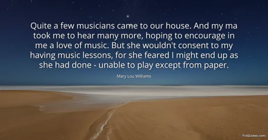 Williams, Mary Lou. "Quite a few musicians came to our house. And my ma took me to hear many more, hoping to encourage in me a love of music. But she wouldn't consent to my having music lessons, for she feared I might end up as she had done - unable to play except from paper." FixQuotes. January 16, 2026. https://fixquotes.com/quotes/quite-a-few-musicians-came-to-our-house-and-my-ma-108160/.