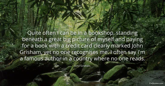 Grisham, John. "Quite often I can be in a bookshop, standing beneath a great big picture of myself and paying for a book with a credit card clearly marked John Grisham, yet no one recognises me. I often say I'm a famous author in a country where no one reads." FixQuotes. January 16, 2026. https://fixquotes.com/quotes/quite-often-i-can-be-in-a-bookshop-standing-131163/.