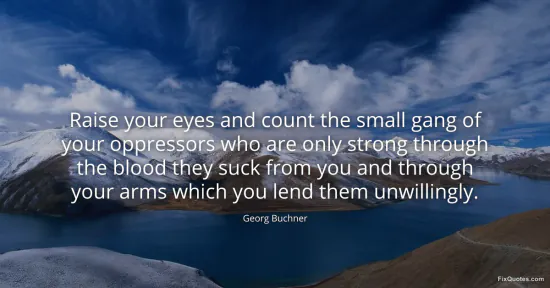 Buchner, Georg. "Raise your eyes and count the small gang of your oppressors who are only strong through the blood they suck from you and through your arms which you lend them unwillingly." FixQuotes. January 17, 2026. https://fixquotes.com/quotes/raise-your-eyes-and-count-the-small-gang-of-your-54244/.