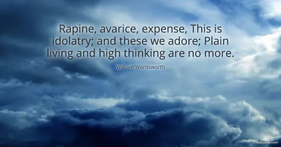 "Rapine, avarice, expense, This is idolatry; and these we adore; Plain living and high thinking are no more." FixQuotes, 18 Jan. 2026, https://fixquotes.com/quotes/rapine-avarice-expense-this-is-idolatry-and-these-15176/. Accessed 12 Feb. 2026.