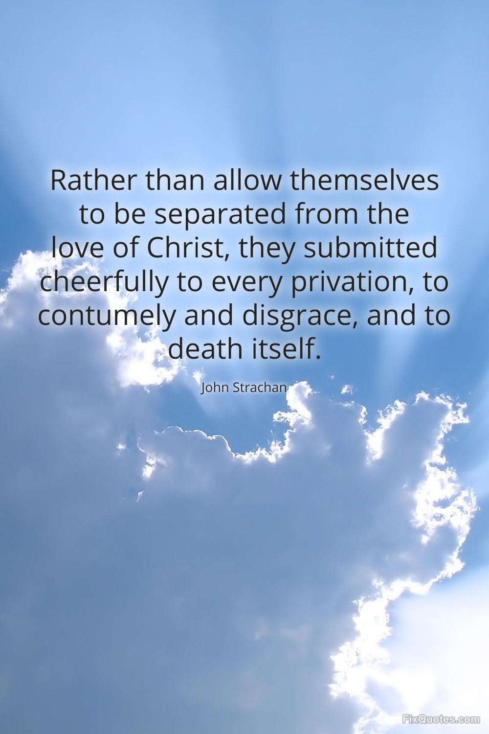 Strachan, John. (2026, January 16). Rather than allow themselves to be separated from the love of Christ, they submitted cheerfully to every privation, to contumely and disgrace, and to death itself. FixQuotes. https://fixquotes.com/quotes/rather-than-allow-themselves-to-be-separated-from-98318/