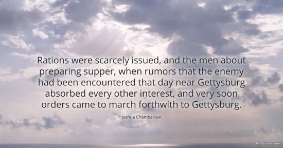 Chamberlain, Joshua. "Rations were scarcely issued, and the men about preparing supper, when rumors that the enemy had been encountered that day near Gettysburg absorbed every other interest, and very soon orders came to march forthwith to Gettysburg." FixQuotes. January 16, 2026. https://fixquotes.com/quotes/rations-were-scarcely-issued-and-the-men-about-114316/.