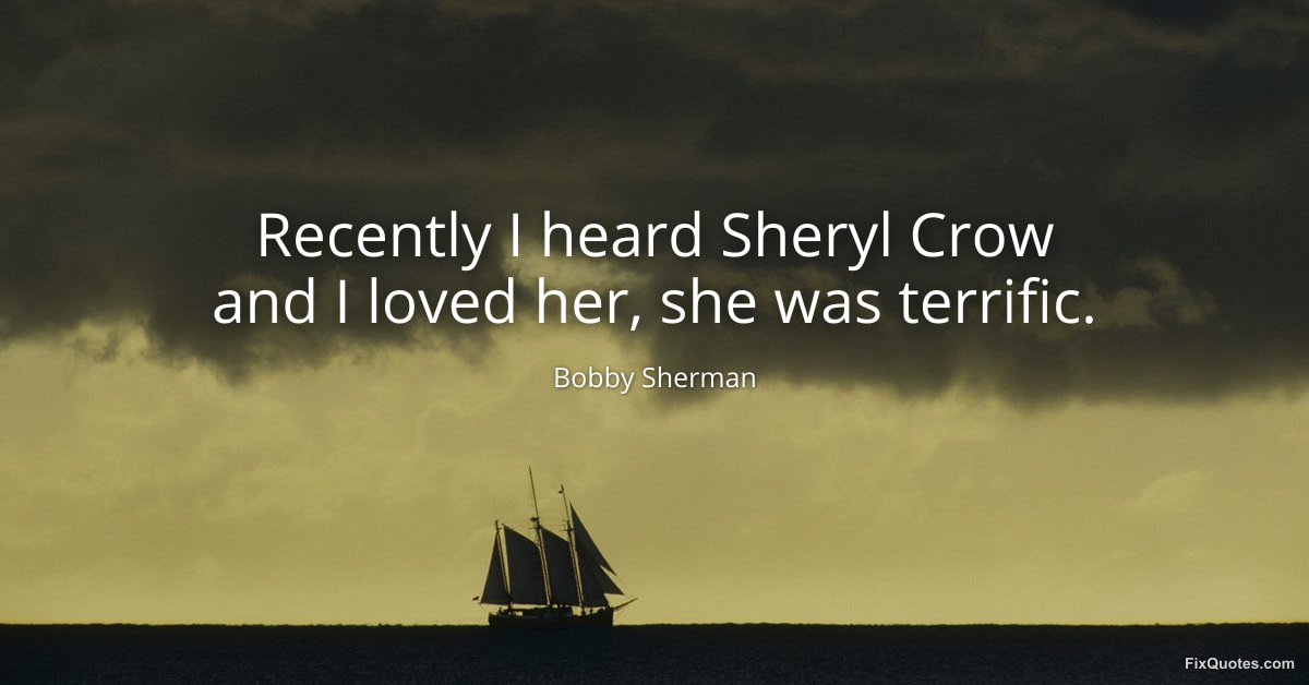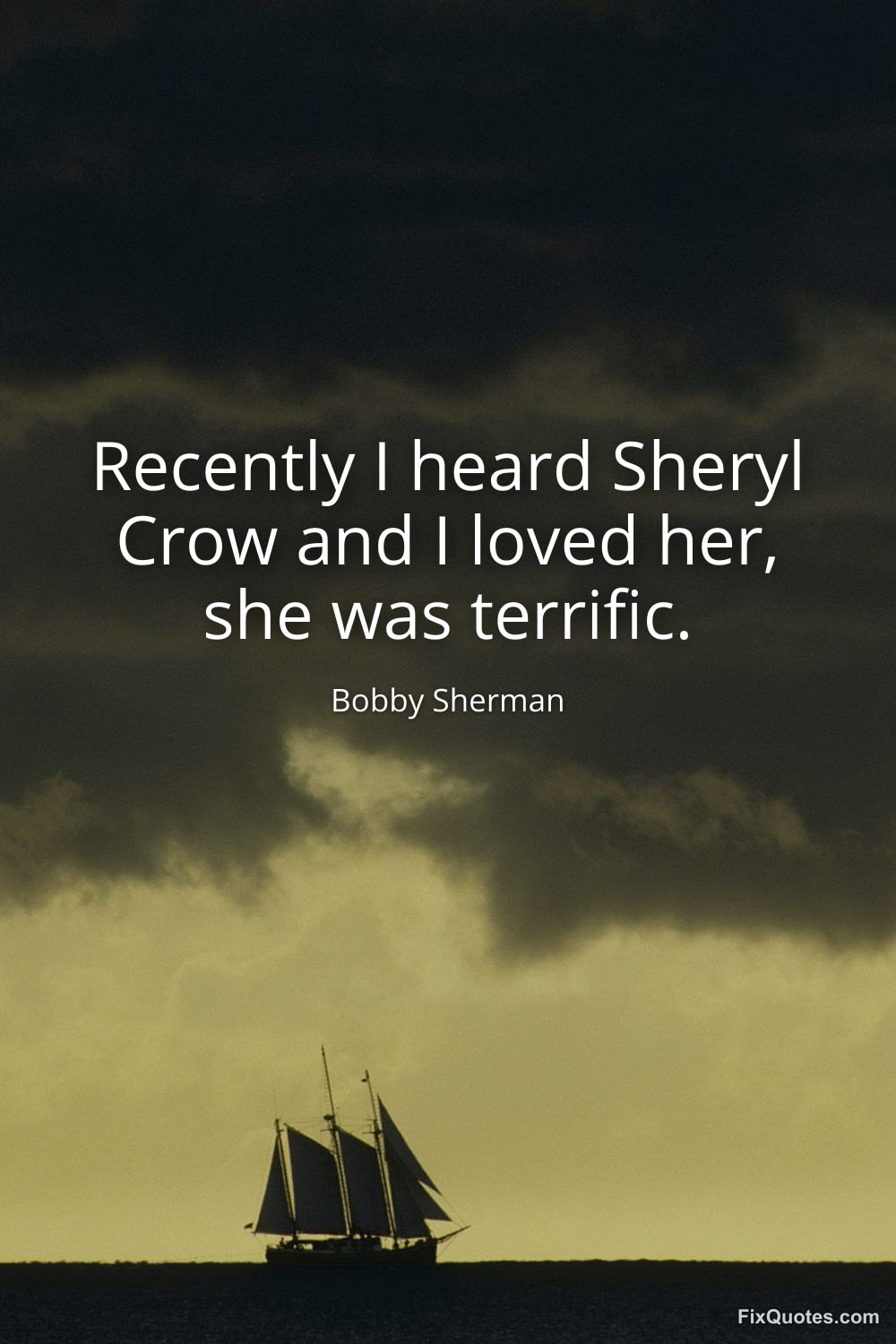 Sherman, Bobby. (2026, January 15). Recently I heard Sheryl Crow and I loved her, she was terrific. FixQuotes. https://fixquotes.com/quotes/recently-i-heard-sheryl-crow-and-i-loved-her-she-140025/