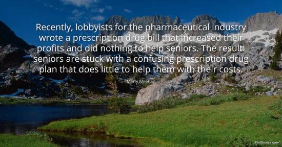 Meehan, Marty. (2026, January 17). Recently, lobbyists for the pharmaceutical industry wrote a prescription drug bill that increased their profits and did nothing to help seniors. The result: seniors are stuck with a confusing prescription drug plan that does little to help them with their costs. FixQuotes. https://fixquotes.com/quotes/recently-lobbyists-for-the-pharmaceutical-69712/