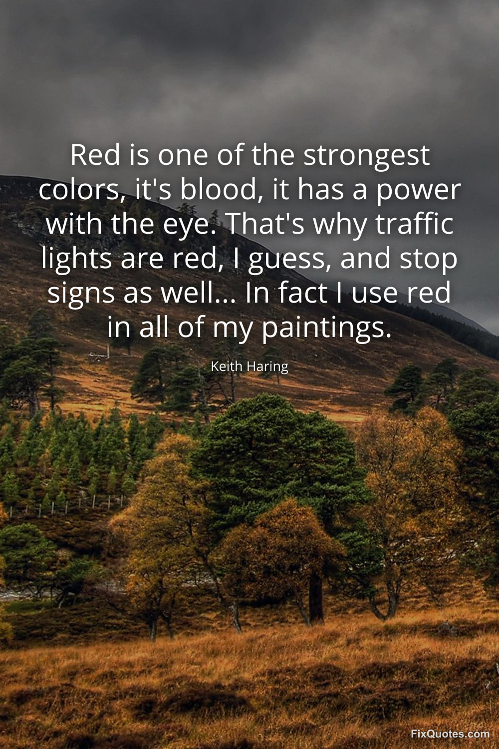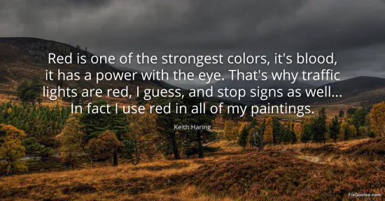 Haring, Keith. (2026, February 16). Red is one of the strongest colors, it's blood, it has a power with the eye. That's why traffic lights are red, I guess, and stop signs as well... In fact I use red in all of my paintings. FixQuotes. https://fixquotes.com/quotes/red-is-one-of-the-strongest-colors-its-blood-it-126730/