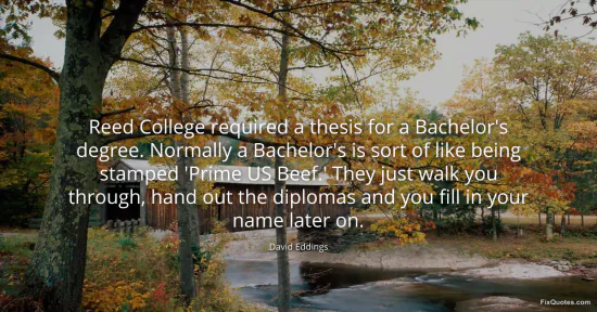 Eddings, David. "Reed College required a thesis for a Bachelor's degree. Normally a Bachelor's is sort of like being stamped 'Prime US Beef.' They just walk you through, hand out the diplomas and you fill in your name later on." FixQuotes. January 17, 2026. https://fixquotes.com/quotes/reed-college-required-a-thesis-for-a-bachelors-45939/.