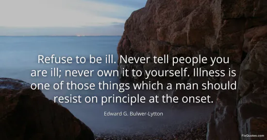 Bulwer-Lytton, Edward G. (2026, January 18). Refuse to be ill. Never tell people you are ill; never own it to yourself. Illness is one of those things which a man should resist on principle at the onset. FixQuotes. https://fixquotes.com/quotes/refuse-to-be-ill-never-tell-people-you-are-ill-12721/