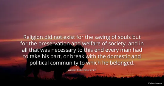 Smith, William Robertson. "Religion did not exist for the saving of souls but for the preservation and welfare of society, and in all that was necessary to this end every man had to take his part, or break with the domestic and political community to which he belonged." FixQuotes. January 15, 2026. https://fixquotes.com/quotes/religion-did-not-exist-for-the-saving-of-souls-159954/.