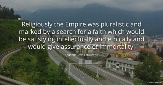 Latourette, Kenneth Scott. "Religiously the Empire was pluralistic and marked by a search for a faith which would be satisfying intellectually and ethically and would give assurance of immortality." FixQuotes. January 15, 2026. https://fixquotes.com/quotes/religiously-the-empire-was-pluralistic-and-marked-144293/.