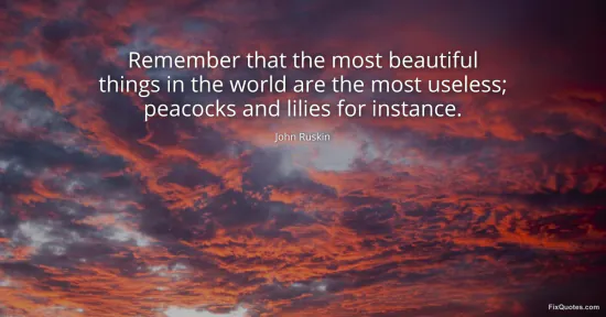 Ruskin, John. (2026, January 18). Remember that the most beautiful things in the world are the most useless; peacocks and lilies for instance. FixQuotes. https://fixquotes.com/quotes/remember-that-the-most-beautiful-things-in-the-8290/