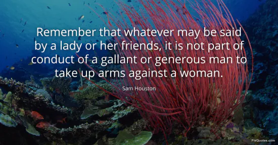 Houston, Sam. "Remember that whatever may be said by a lady or her friends, it is not part of conduct of a gallant or generous man to take up arms against a woman." FixQuotes. January 16, 2026. https://fixquotes.com/quotes/remember-that-whatever-may-be-said-by-a-lady-or-123542/.