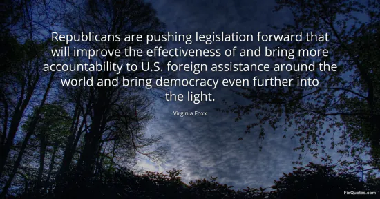 Foxx, Virginia. "Republicans are pushing legislation forward that will improve the effectiveness of and bring more accountability to U.S. foreign assistance around the world and bring democracy even further into the light." FixQuotes. January 16, 2026. https://fixquotes.com/quotes/republicans-are-pushing-legislation-forward-that-97868/.