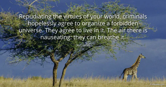 Genet, Jean. (2026, January 17). Repudiating the virtues of your world, criminals hopelessly agree to organize a forbidden universe. They agree to live in it. The air there is nauseating: they can breathe it. FixQuotes. https://fixquotes.com/quotes/repudiating-the-virtues-of-your-world-criminals-56886/