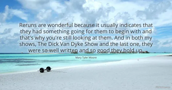 Moore, Mary Tyler. "Reruns are wonderful because it usually indicates that they had something going for them to begin with and that's why you're still looking at them. And in both my shows, The Dick Van Dyke Show and the last one, they were so well written and so good they hold up." FixQuotes. January 15, 2026. https://fixquotes.com/quotes/reruns-are-wonderful-because-it-usually-indicates-155547/.