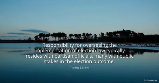 Mann, Thomas E. "Responsibility for overseeing the implementation of election law typically resides with partisan officials, many with public stakes in the election outcome." FixQuotes. January 18, 2026. https://fixquotes.com/quotes/responsibility-for-overseeing-the-implementation-9139/.
