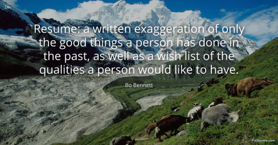 Bennett, Bo. "Resume: a written exaggeration of only the good things a person has done in the past, as well as a wish list of the qualities a person would like to have." FixQuotes. January 15, 2026. https://fixquotes.com/quotes/resume-a-written-exaggeration-of-only-the-good-43999/.