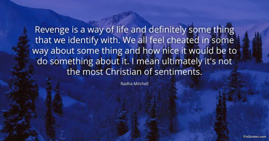 Mitchell, Radha. "Revenge is a way of life and definitely some thing that we identify with. We all feel cheated in some way about some thing and how nice it would be to do something about it. I mean ultimately it's not the most Christian of sentiments." FixQuotes. January 17, 2026. https://fixquotes.com/quotes/revenge-is-a-way-of-life-and-definitely-some-77492/.