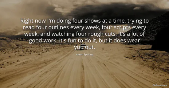 Spelling, Aaron. "Right now I'm doing four shows at a time, trying to read four outlines every week, four scripts every week, and watching four rough cuts; it's a lot of good work. It's fun to do it, but it does wear you out." FixQuotes. January 15, 2026. https://fixquotes.com/quotes/right-now-im-doing-four-shows-at-a-time-trying-to-140083/.