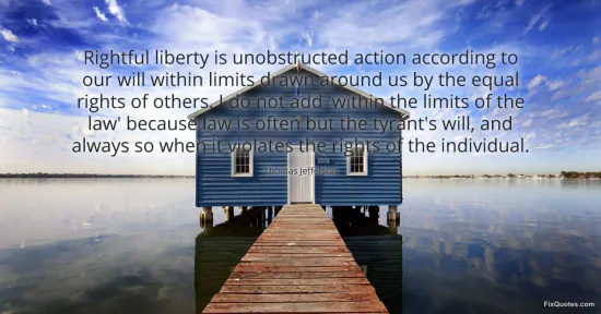 Jefferson, Thomas. (2026, January 17). Rightful liberty is unobstructed action according to our will within limits drawn around us by the equal rights of others. I do not add 'within the limits of the law' because law is often but the tyrant's will, and always so when it violates the rights of the individual. FixQuotes. https://fixquotes.com/quotes/rightful-liberty-is-unobstructed-action-according-33466/