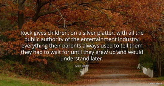 Bloom, Allan. "Rock gives children, on a silver platter, with all the public authority of the entertainment industry, everything their parents always used to tell them they had to wait for until they grew up and would understand later." FixQuotes. January 17, 2026. https://fixquotes.com/quotes/rock-gives-children-on-a-silver-platter-with-all-24732/.