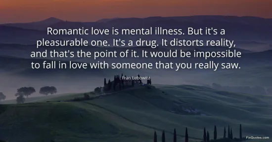 Lebowitz, Fran. (2026, January 17). Romantic love is mental illness. But it's a pleasurable one. It's a drug. It distorts reality, and that's the point of it. It would be impossible to fall in love with someone that you really saw. FixQuotes. https://fixquotes.com/quotes/romantic-love-is-mental-illness-but-its-a-33196/