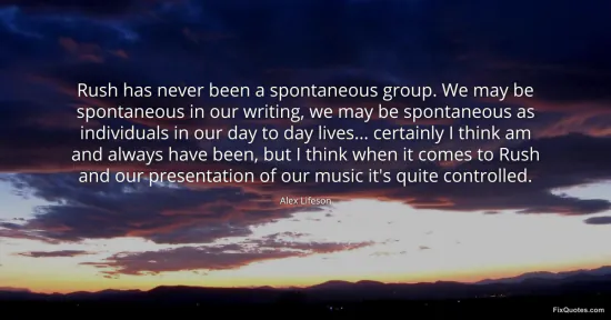 Lifeson, Alex. (2026, January 15). Rush has never been a spontaneous group. We may be spontaneous in our writing, we may be spontaneous as individuals in our day to day lives... certainly I think am and always have been, but I think when it comes to Rush and our presentation of our music it's quite controlled. FixQuotes. https://fixquotes.com/quotes/rush-has-never-been-a-spontaneous-group-we-may-be-144709/