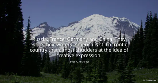 Michener, James A. (2026, January 15). Russia, France, Germany and China. They revere their writers. America is still a frontier country that almost shudders at the idea of creative expression. FixQuotes. https://fixquotes.com/quotes/russia-france-germany-and-china-they-revere-their-58532/