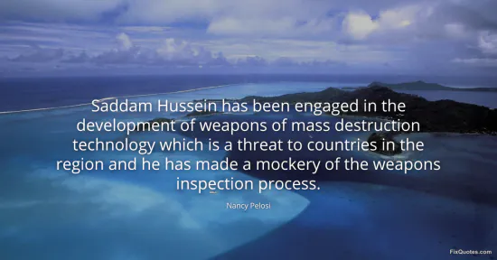 Pelosi, Nancy. "Saddam Hussein has been engaged in the development of weapons of mass destruction technology which is a threat to countries in the region and he has made a mockery of the weapons inspection process." FixQuotes. January 18, 2026. https://fixquotes.com/quotes/saddam-hussein-has-been-engaged-in-the-971/.