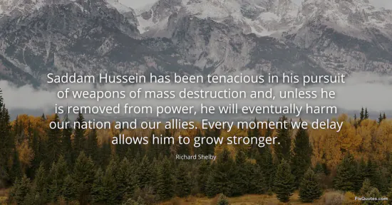 Shelby, Richard. (2026, January 16). Saddam Hussein has been tenacious in his pursuit of weapons of mass destruction and, unless he is removed from power, he will eventually harm our nation and our allies. Every moment we delay allows him to grow stronger. FixQuotes. https://fixquotes.com/quotes/saddam-hussein-has-been-tenacious-in-his-pursuit-115599/