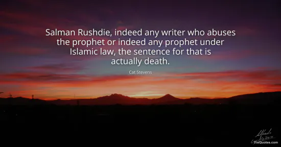 Stevens, Cat. "Salman Rushdie, indeed any writer who abuses the prophet or indeed any prophet under Islamic law, the sentence for that is actually death." FixQuotes. January 18, 2026. https://fixquotes.com/quotes/salman-rushdie-indeed-any-writer-who-abuses-the-12699/.