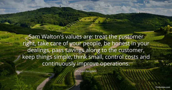 Bergdahl, Michael. (2026, January 15). Sam Walton's values are: treat the customer right, take care of your people, be honest in your dealings, pass savings along to the customer, keep things simple, think small, control costs and continuously improve operations. FixQuotes. https://fixquotes.com/quotes/sam-waltons-values-are-treat-the-customer-right-93844/