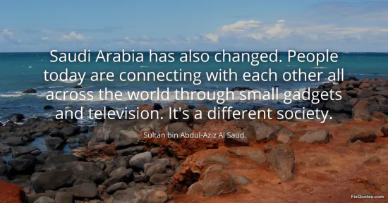 Saud, Sultan bin Abdul-Aziz Al. (2026, January 16). Saudi Arabia has also changed. People today are connecting with each other all across the world through small gadgets and television. It's a different society. FixQuotes. https://fixquotes.com/quotes/saudi-arabia-has-also-changed-people-today-are-107191/