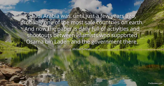 Scheuer, Michael. "Saudi Arabia was, until just a few years ago, probably one of the most safe countries on earth. And now the paper is daily full of activities and shootouts between Islamists who supported Osama bin Laden and the government there." FixQuotes. January 16, 2026. https://fixquotes.com/quotes/saudi-arabia-was-until-just-a-few-years-ago-93734/.