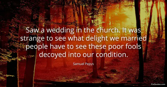 Pepys, Samuel. (2026, January 15). Saw a wedding in the church. It was strange to see what delight we married people have to see these poor fools decoyed into our condition. FixQuotes. https://fixquotes.com/quotes/saw-a-wedding-in-the-church-it-was-strange-to-see-155992/