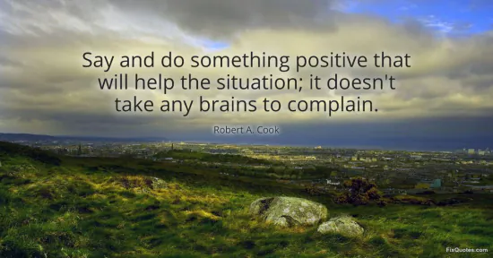 Cook, Robert A. "Say and do something positive that will help the situation; it doesn't take any brains to complain." FixQuotes. January 16, 2026. https://fixquotes.com/quotes/say-and-do-something-positive-that-will-help-the-132368/.